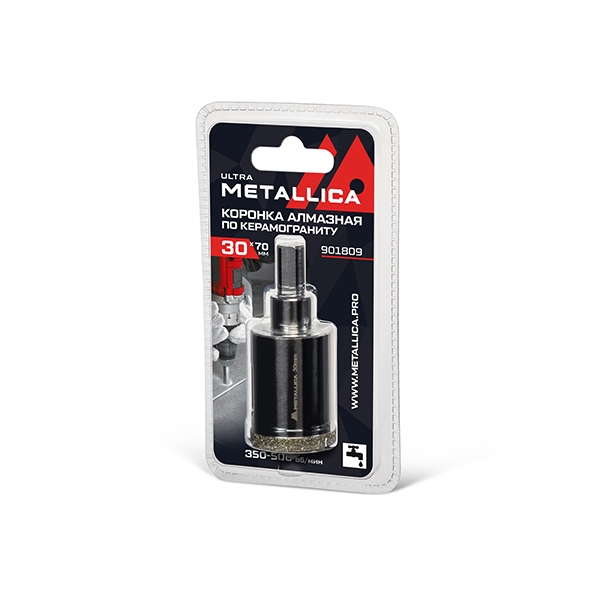 Коронка алмазная METALLICA Ultra 30х70 мм, #46, с сверлом, по керамограниту, плитке, в блистере.