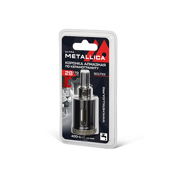 Коронка алмазная METALLICA Ultra 28х70 мм, #46, с сверлом, по керамограниту, плитке, в блистере.