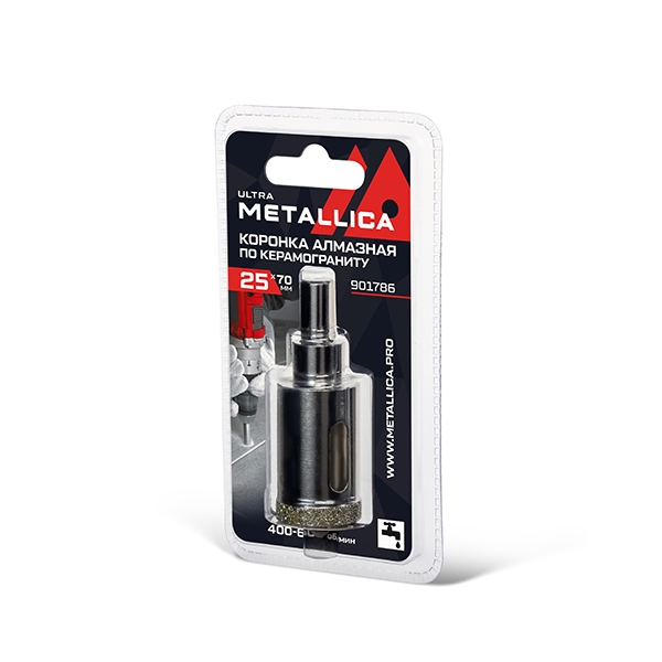 Коронка алмазная METALLICA Ultra 25х70 мм, #46, с сверлом, по керамограниту, плитке, в блистере.