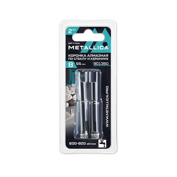 Коронки алмазные METALLICA Optima 8x55 мм, #80, по стеклу, плитке, 2 шт, в блистере.