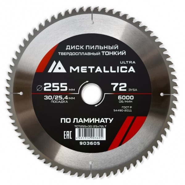Диск пильный ТОНКИЙ тв. спл. METALLICA Ultra 255x30/25,4 мм, 72 зуб, Т=2,2 мм по ламинату