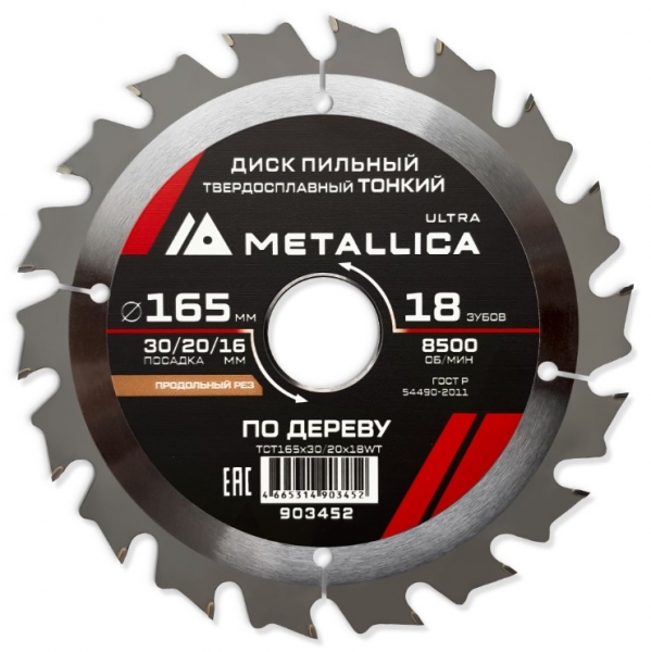 Диск пильный ТОНКИЙ тв. спл. METALLICA Ultra 165x30/20/16 мм, 18 зуб, Т=1,6 мм по дереву продольн.