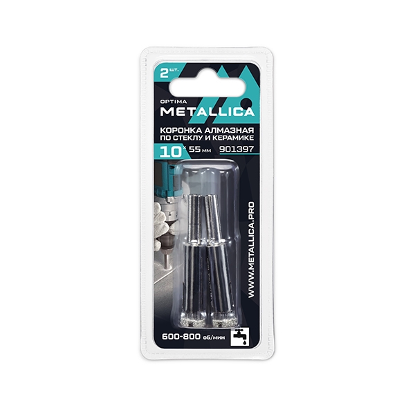 Коронки алмазные METALLICA Optima 10x55 мм, #80, по стеклу, плитке, 2 шт, в блистере.