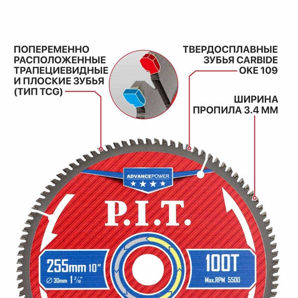 Диск пильный по алюминию P.I.T. ADVANCE 255x30x2.4 мм, 100T Carbide, зуб TCG 5°