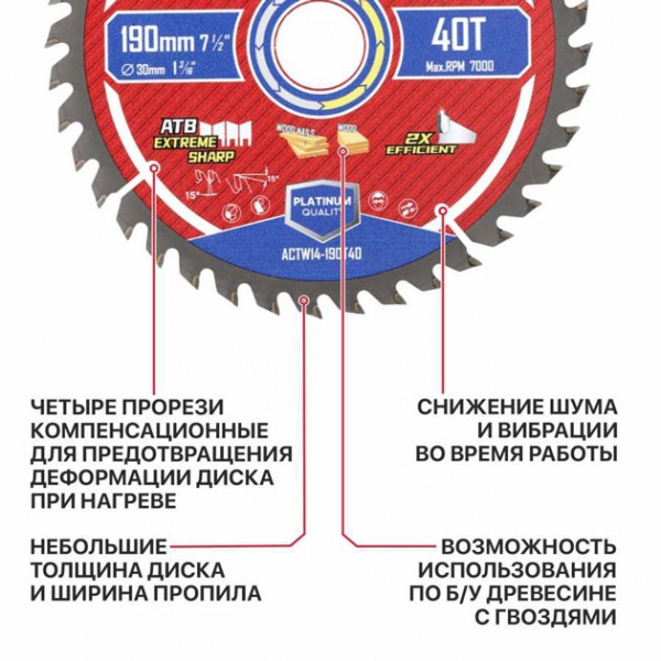 ПодробнееДиск пильный с твердосплавными напайками по дереву для циркулярных и торцовочных пил ACTW14-190T40 отличный вариант для распила древесины, досок, многослойных плит, древесностружечных плит (ДСП, OSB, фанеры и т.д.).
