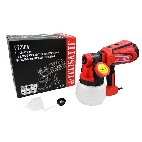FELISATTI FT2104 750 — надежный и мощный краскораспылитель, который обеспечит профессиональное качество покраски и удобство в работе как для опытных мастеров, так и для домашних пользователей.