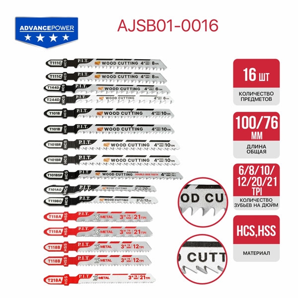 Набор пилок для лобзиков P.I.T. ADVANCE 16 шт, дерево/металл/фигурный рез, блистер
