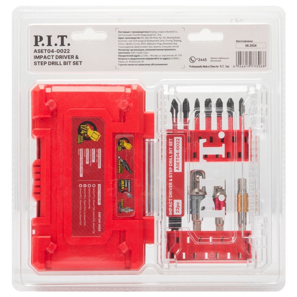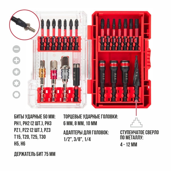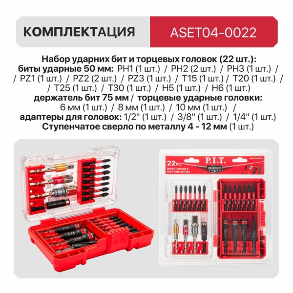 Набор ударных бит и торцевых головок P.I.T. DRUA (22шт, адапт. 1/2",1/4",3/8", ступ.св.)